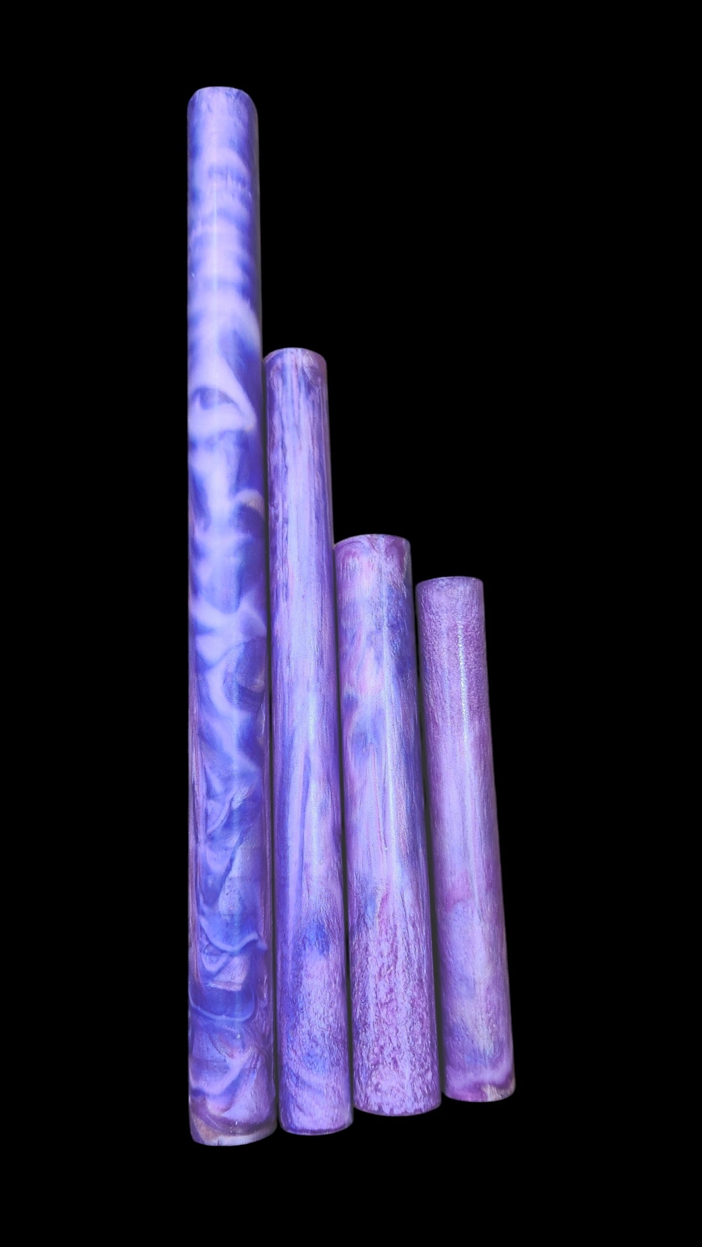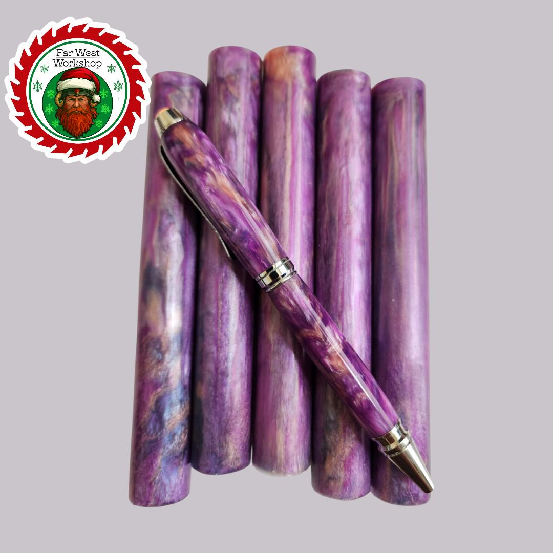 The workshop is buzzing with holiday energy β cocoa steaming, lights twinkling, glitter drifting through the air like festive snow. And right at the center of the chaos sits our newest creation: a stunning pen blank swirling with rich purples and vibrant pinks, looking like it just stepped out of a sugar-plum dream.