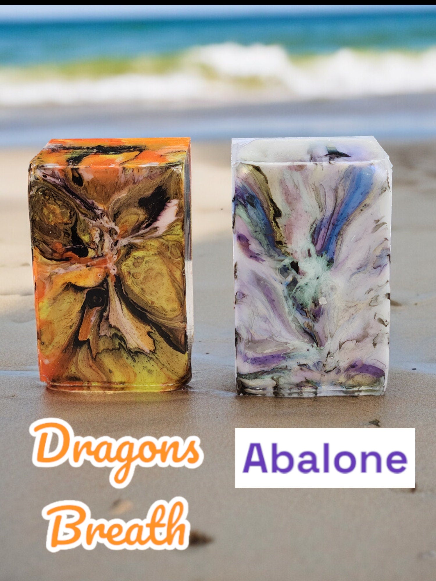 The Abalone (faux) Duck Call blanks are made to look like abalone shells. They have a beautiful iridescence that shines in blue, pink, and purple colors similar to opal or mother of pearl. Black streaks are added to enhance their appearance, making them look like real abalone shells with vibrant colors.