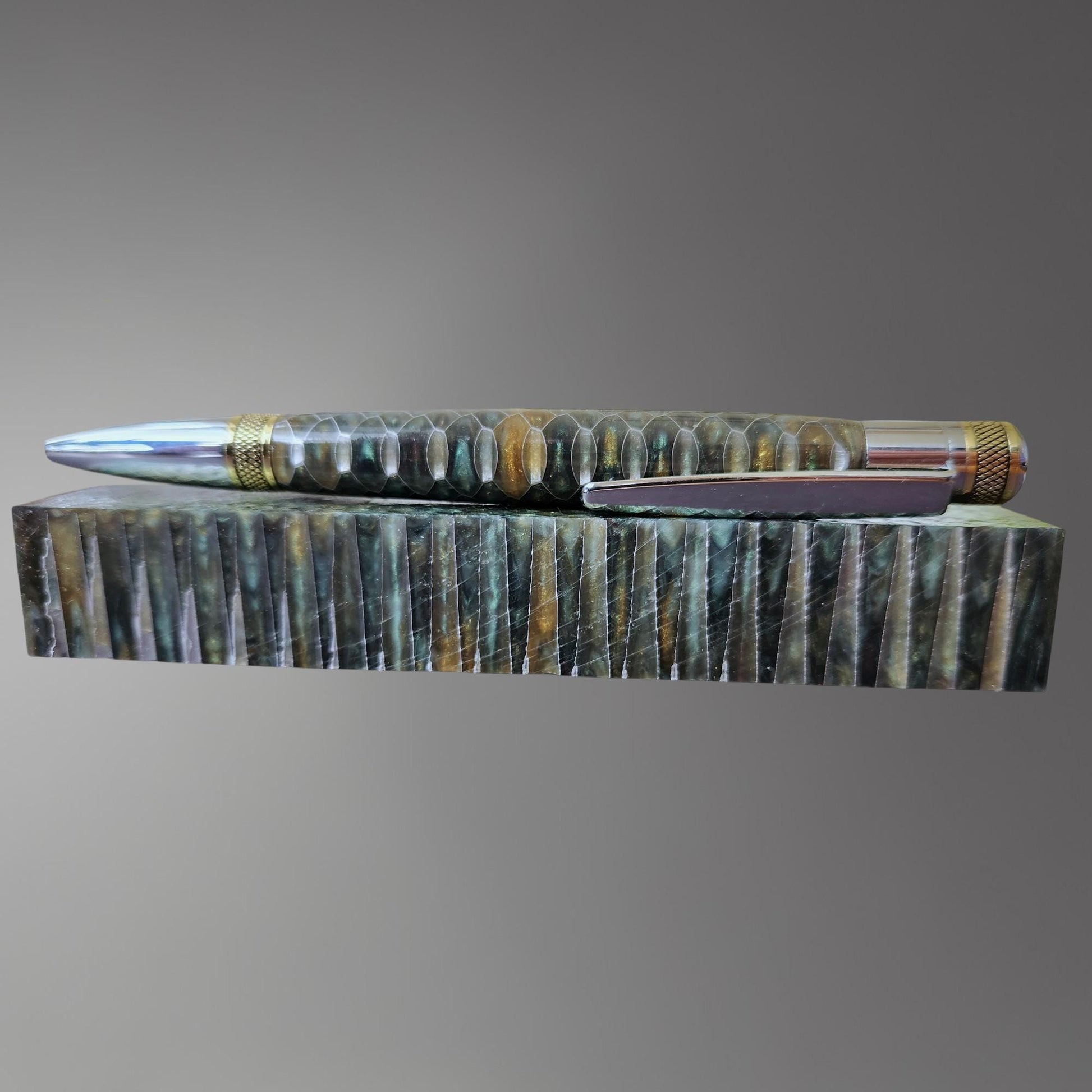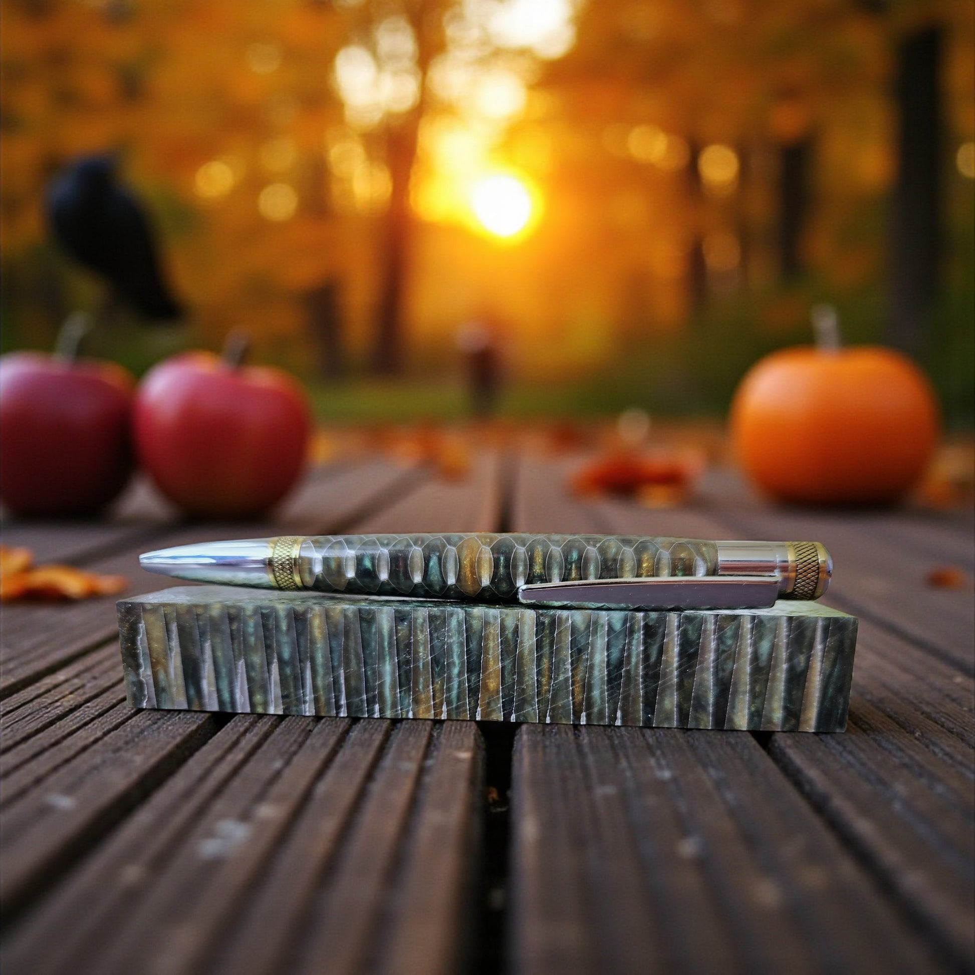 Slither into something stunning with the Nagini Honeycomb Pen Blank — a mesmerizing mix of teal, gold, green, and purple that shimmers like enchanted scales in candlelight. 💫